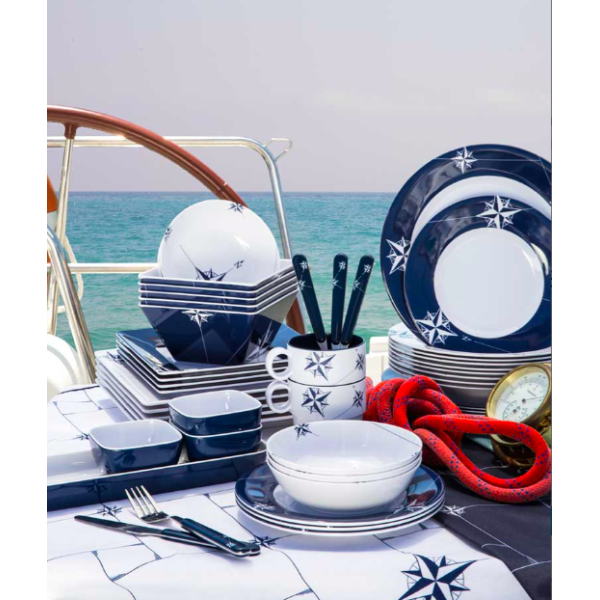 Комплекта от 24 меламинови съда и кошница Northwind е предназначен за 6 души.Състои се от 6 плоски чинии, 6 супени чинии, 6 десертни чинии, 6 подреждащи се чаши и кошница за контейнери.Всички части са изработени от нечуплив двуцветен меламин (син външен вид) и влизат в многофункционалната кошница, която може да се използва за съхранение на меламинови съдове или като контейнер за морски принадлежно..