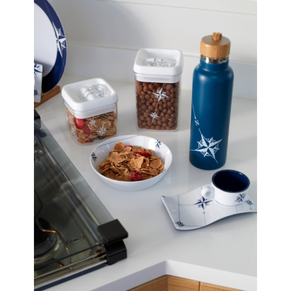 Практичен комплект от 4 прозрачни кухненски буркана с морски дизайн. Изработени от MS – практически нечуплив материал – идеален за лодка.